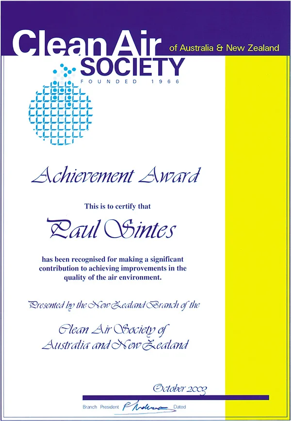 Following the work he did in this region, in 2003 Paul Sintes received the shown Achievement Award from the Clean Air Society of Australia and New Zealand for the significant contribution to the improvement of air quality that Ethos fires made to the Christchurch area over this time.